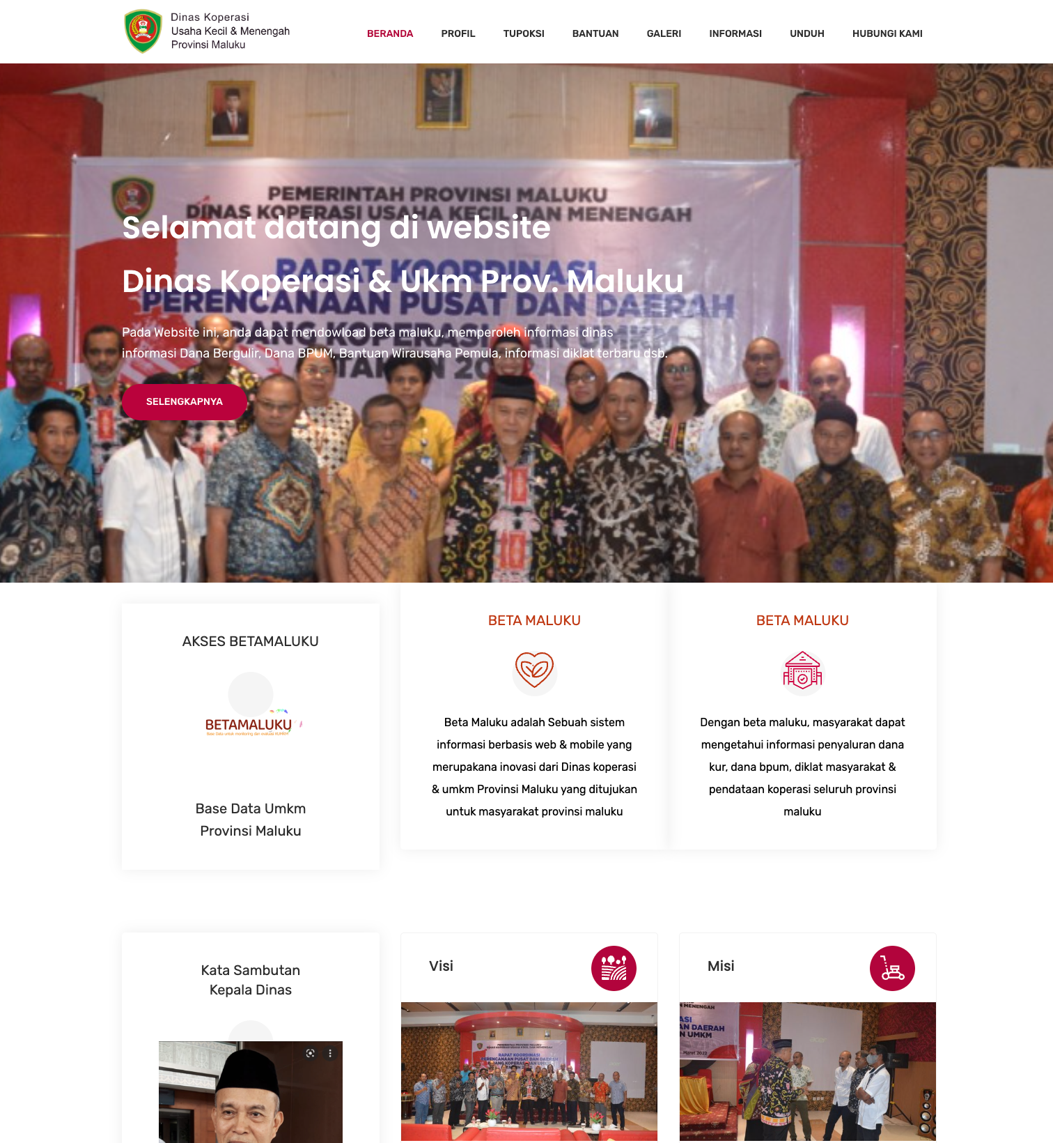 Pembuatan website Dinas koperasi & ukm Provinsi Maluku. dengan kehadiran website dinas, diharapkan masyarakat dapat mudah menemukan informasi seputar ukm & koperasi yang ada di provinsi maluku. website menampilkan informasi tata cara pengajuan dana, kegiatan dinas, galeri, unduh & berbagai informasi lainnya.